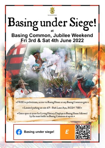 Basing under Siege! Friday 3rd and Saturday the 4th June 2022. Free entry on foot, or £5 to park onsite. See: https://www.eventbrite.co.uk/e/sealed-knot-english-civil-war-re-enactment-event-basing-common-tickets-337298156867 for parking tickets